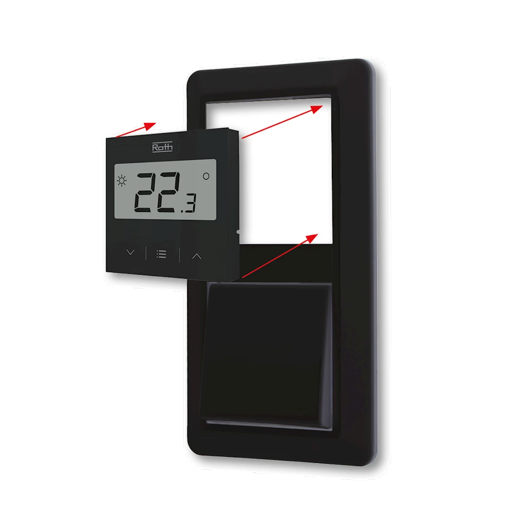 Bygges inn i standard ELKO rammesystemer. Enkel og trådløs installasjon. Termostaten kobles til 230V strøm, ingen batterier.