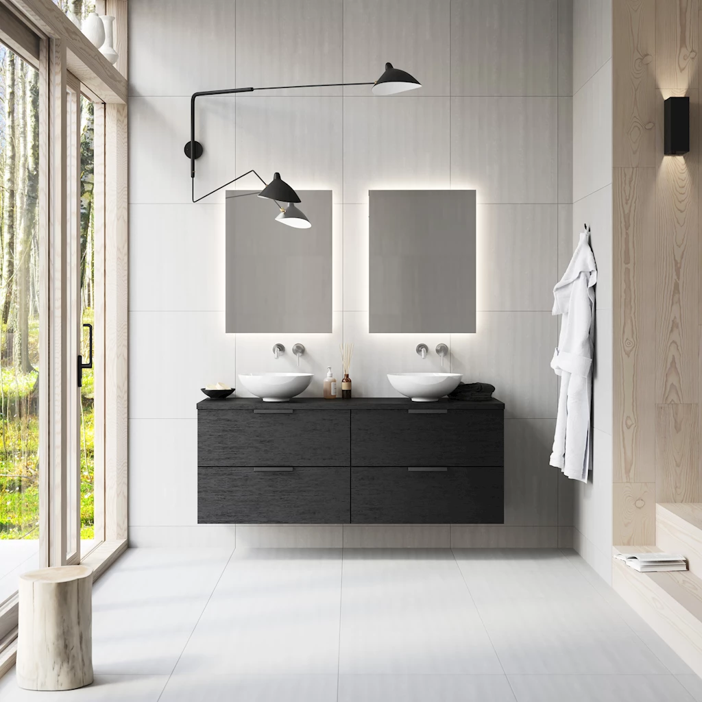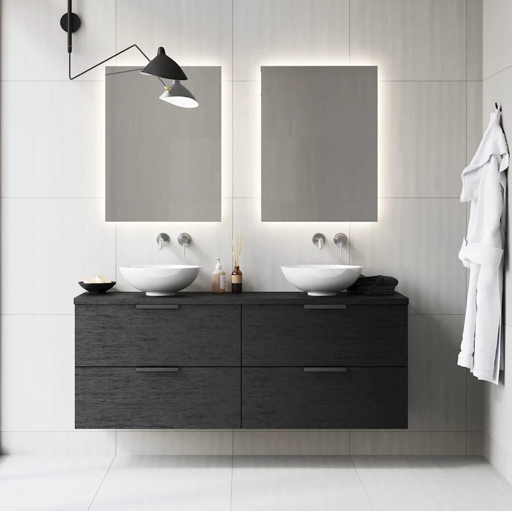 Elegant møbel i Sort eik med Rondo bolleservanter. Frame speil med lys/antidugg.