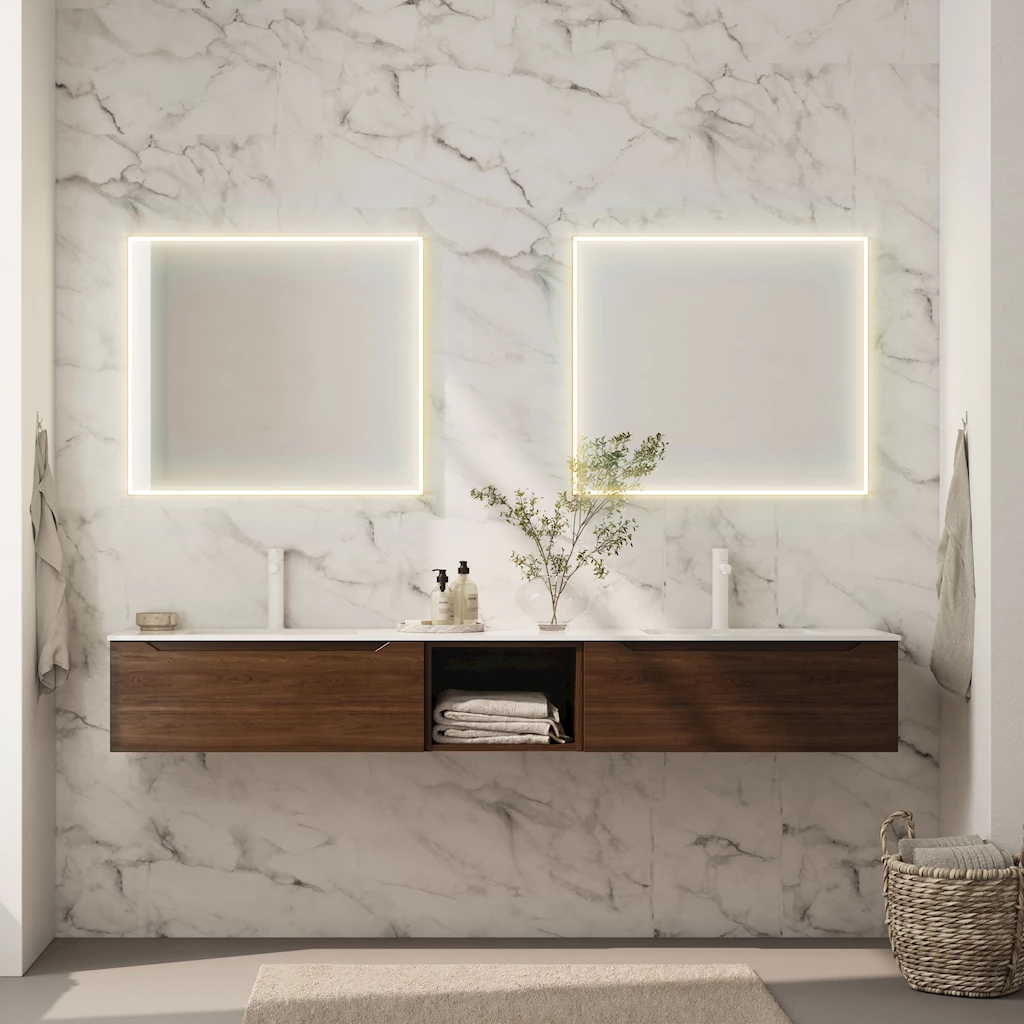 Dette oppsettet består av EMMA Mørk Eik 80 cm + 80 cm underskap. Åpen hylle 40 cm. Corianplate 2 meter med EIR X 2. FRAMFJORD speil 80 cm X 2