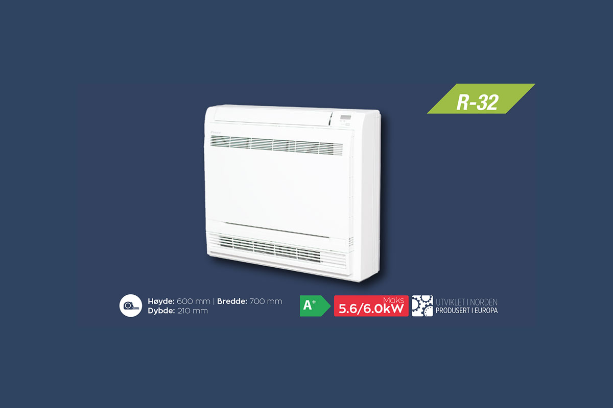Daikin Standard gulvmodell har to utblåsninger. Den nedre utblåsningen sikrer behagelig spredning av varme langs gulvene.